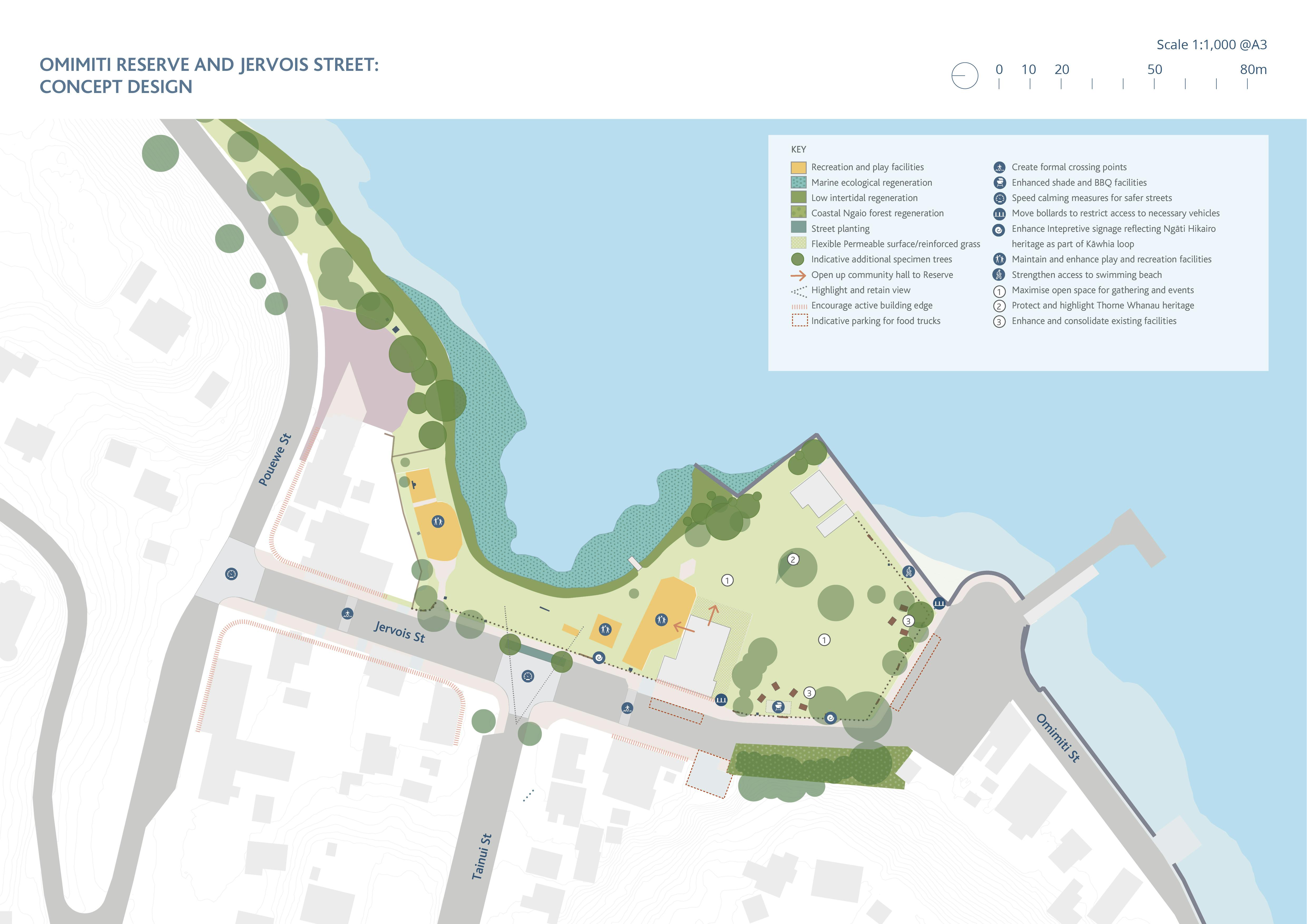 The adopted Aotea Beach and Omimiti Reserve plans build on existing recreation spaces with improvements like better pathways and parking, ecological restoration, new community facilities, shade and seating, play areas, event spaces, and cultural features that celebrate local heritage.